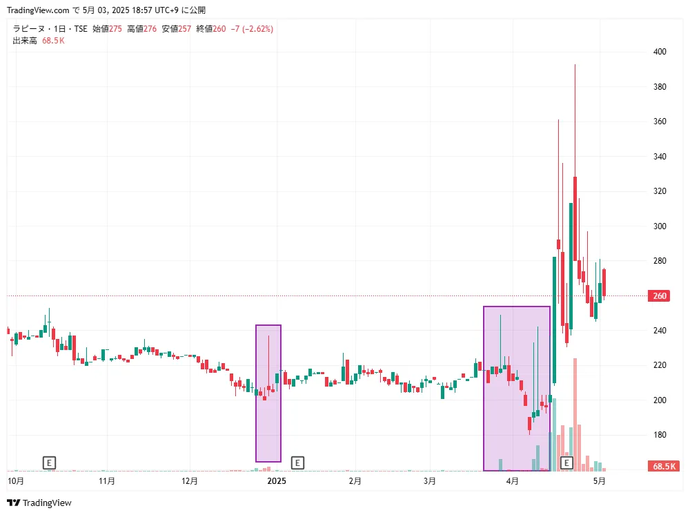 材料のないタイミングで、出来高を伴った急騰や長いヒゲ(上下に大きな値幅)を形成している銘柄が複数確認された。 これらは板が薄い中で一方向の注文が入っただけで起きる値動きではなく、実際の売買が伴って価格が形成されたことを示している。 通常であれば価格が動かない銘柄に、何らかの意図を持った資金の流入があった可能性があると考えられる。